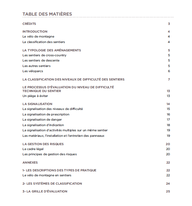 Ce guide est destiné à quiconque a la responsabilité du développement et de l’encadrement de sentiers de vélo de montagne. Il propose une adaptation simplifiée des meilleures pratiques en vigueur en Amérique du Nord (IMBA, Whistler trail standards) et une méthode de classification et de signalisation unifiée, lesquelles visent l’amélioration de la sécurité et de la promotion du vélo de montagne. Il aborde également l’aspect de la gestion des risques.